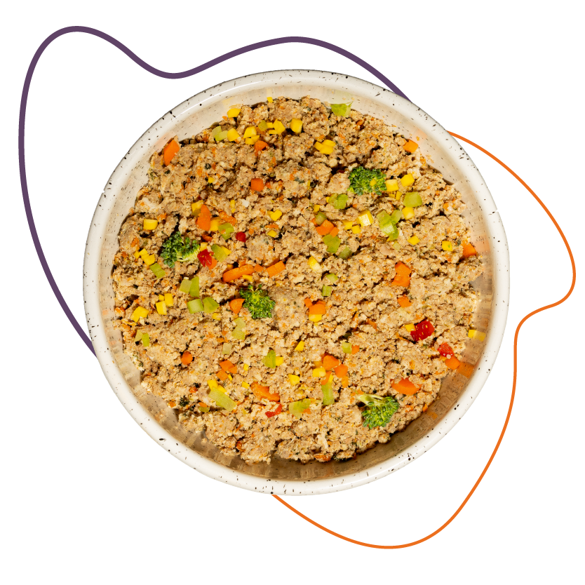 Turkey (Meat, Organs, Muscles, Tendons and Ground Bones), Carrots, Broccoli, Squash, Kale, Spinach, Apple, Banana, Pear, Extra Virgin Olive Oil, Oatmeal, Probiotics, Essential Fatty Acids and Essential Oils, Vitamins, Minerals and lots of love.